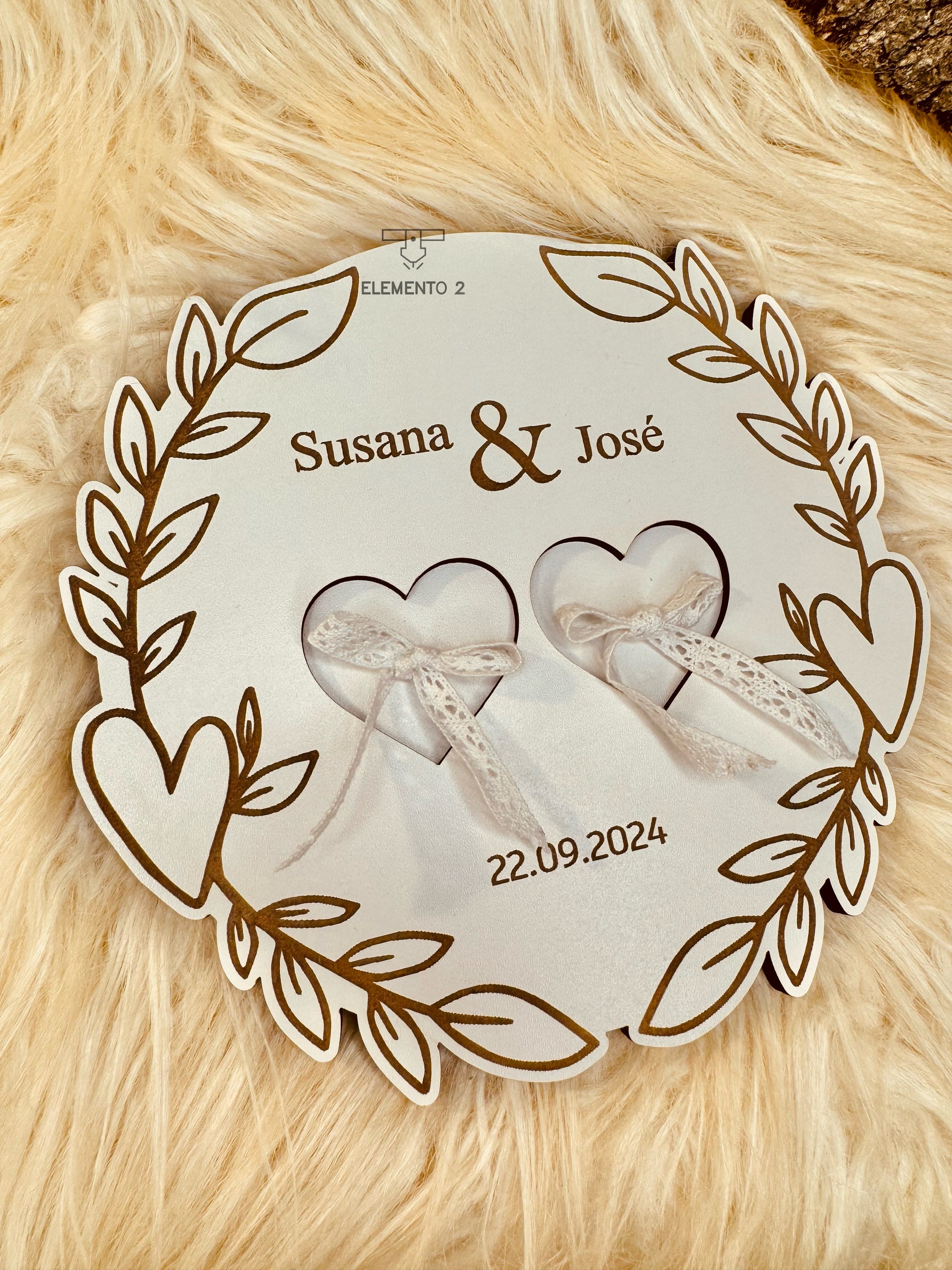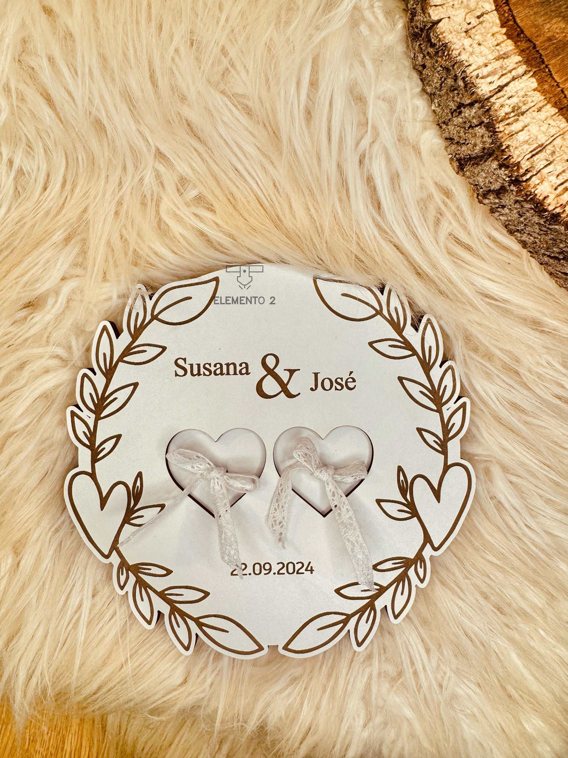 Torna o momento da troca de alianças ainda mais especial com este porta-alianças personalizado, pensado para acrescentar um toque de elegância e significado à cerimónia. Um detalhe inesquecível para o dia mais importante das vossas vidas.